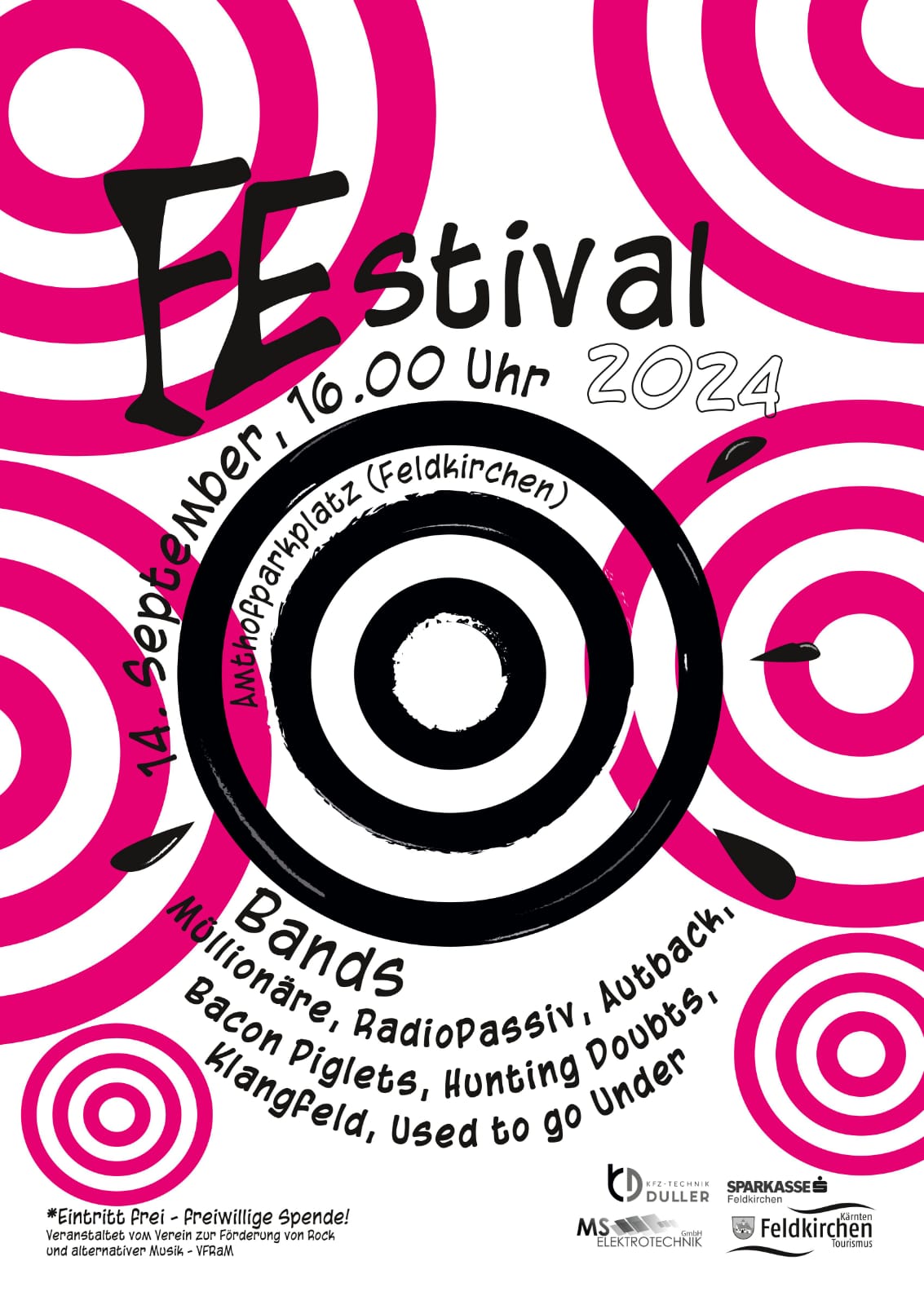 Wir freuen uns riesig, dabei zu sein! Am Samstag, 14. September 2024 rockt Klangfeld das Fe‘stival in Feldkirchen am Amthofparkplatz. Gemeinsam mit sechs weiteren großartigen Bands bringen wir die Tiebelstadt zum Beben! Dieses Jahr erwartet euch eine noch größere Bühne, verbesserte Soundanlage und eine einmalige Festivalstimmung.